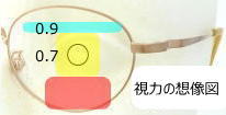 | 上記のお客様の場合、 全部が0.7より、左図のように、 中近両用であっても、 上半分近くが0.7〜0.9になる感じです。 |