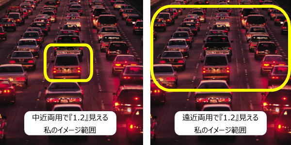 私が「遠近両用」と「中近両用」の其々の眼鏡で、渋滞の中の1台を中心に見た時、