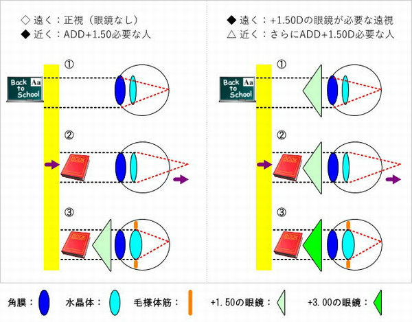 (遠用+1.50 + 加入度数+1.50 = +3.00)⇒右側の(3)の状態。
